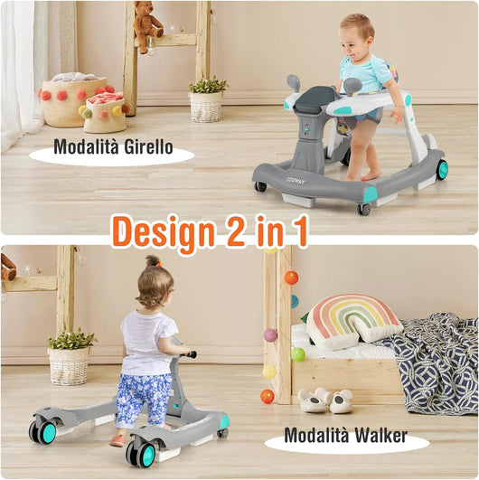 • Girello per Bambini 4 in 1, Girello Pieghevole con Altezza e Velocità Regolabili, Carillon con Luci, Volante e Sedile, Primi Passi per Bambini 6-18 Mesi, Portata 15 kg (Blu)