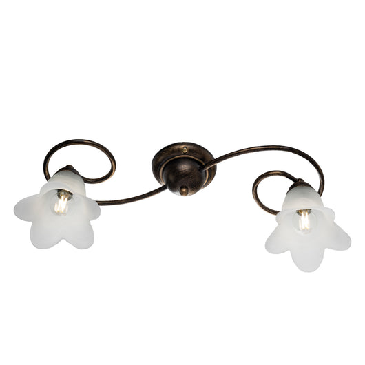 Plafoniera 2 Luci Alice Ferro Battuto Marrone E Oro Vetro Bianco