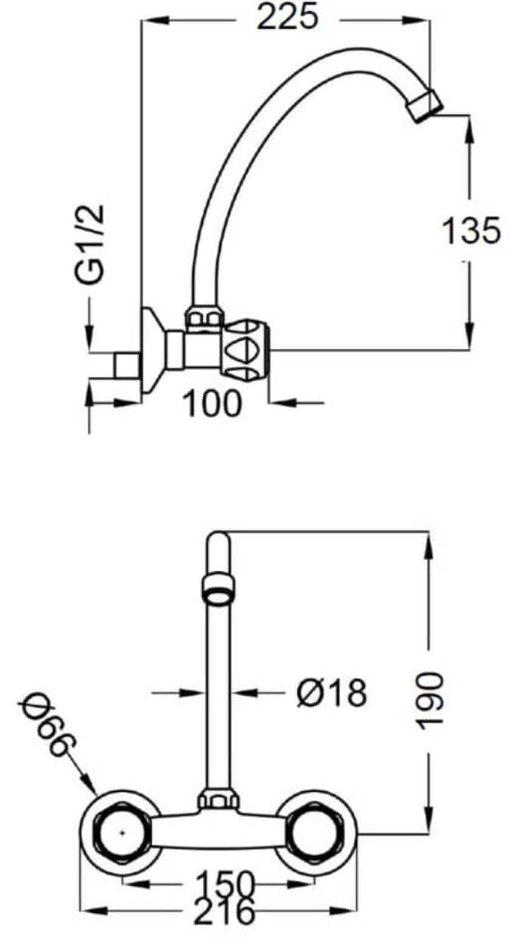 • Rubinetto cucina lavanderia a muro con canna girevole, in ottone canna alta