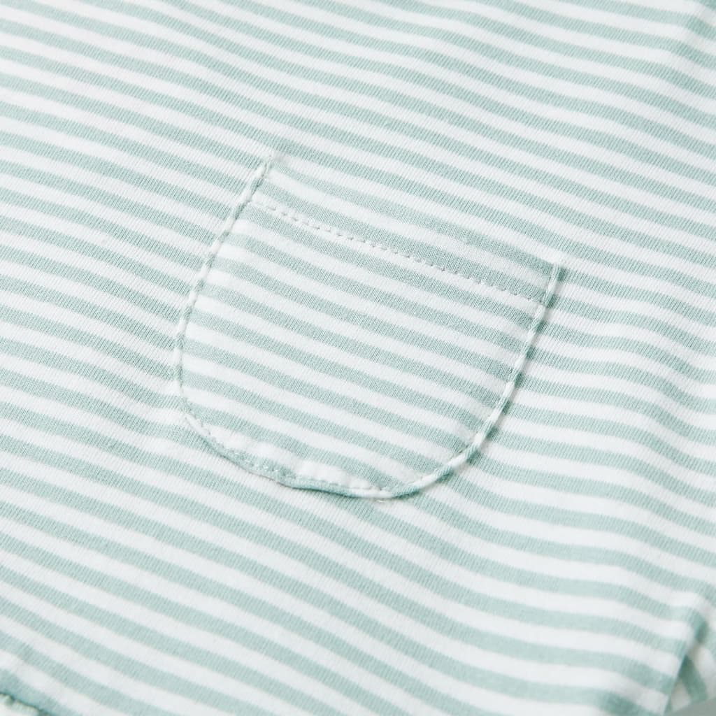 Questo abito da bambina ha girocollo, maniche a volant, e una tasca sul petto. Questo abito da bambina color menta presenta delle strisce ripetute. L'abito corto da bambina è realizzato in un materiale morbido composto da cotone ed elastan per offrire comfort e traspirabilità.