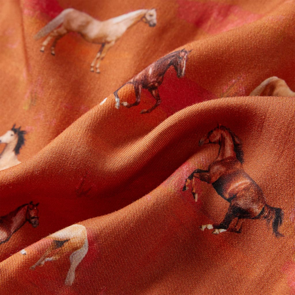 Questo abito da bambina ha maniche lunghe, un colletto a fascia, e si chiude con dei bottoni anteriori. L'abito per bambine ha le stampe di adorabili cavalli, i polsini elasticizzati, e cuciture arricciate sulla vita e sul ginocchio. Realizzata in lyocell, la gonna per bambine è morbida e traspirante.