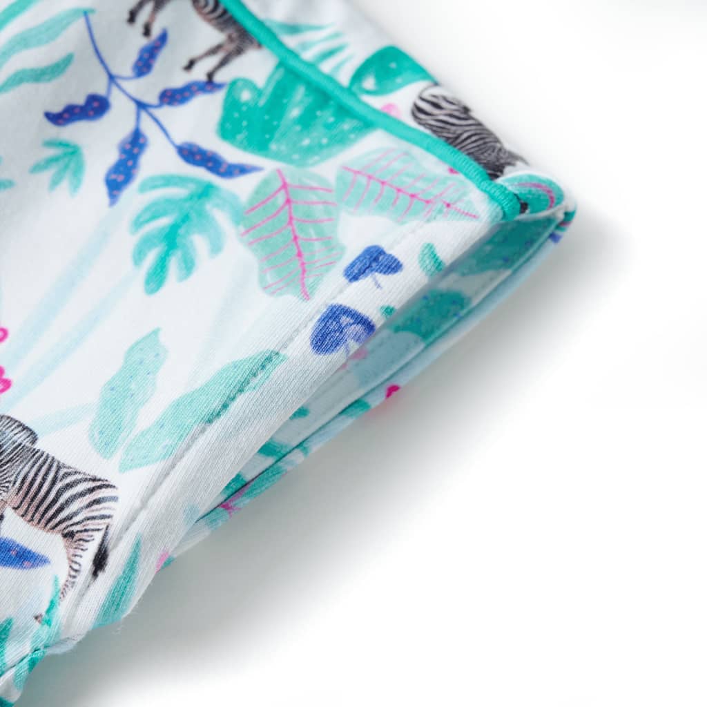 Questo abito da bambina ha girocollo, maniche ad aletta, vita elasticizzata con coulisse, e si chiude con un bottone sul collo. Questo abito per bambine presenta le stampe di zebre, fiori e foglie. L'abito corto da bambina è realizzato in un materiale morbido composto dal 94% in cotone e dal 6% in elastan per offrire comfort e traspirabilità.