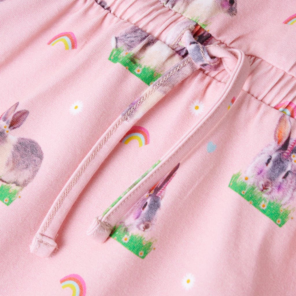 Questo abito da bambina ha girocollo, maniche ad aletta, vita elasticizzata con coulisse, e si chiude con un bottone sul collo. Questo abito per bambine presenta le stampe ripetute di conigli con un corno sulla testa ed è decorato con motivi di fiori e arcobaleni. L'abito corto per bambine è realizzato in un materiale morbido composto dal 92% in cotone e dall'8% in elastan per offrire comfort e traspirabilità.