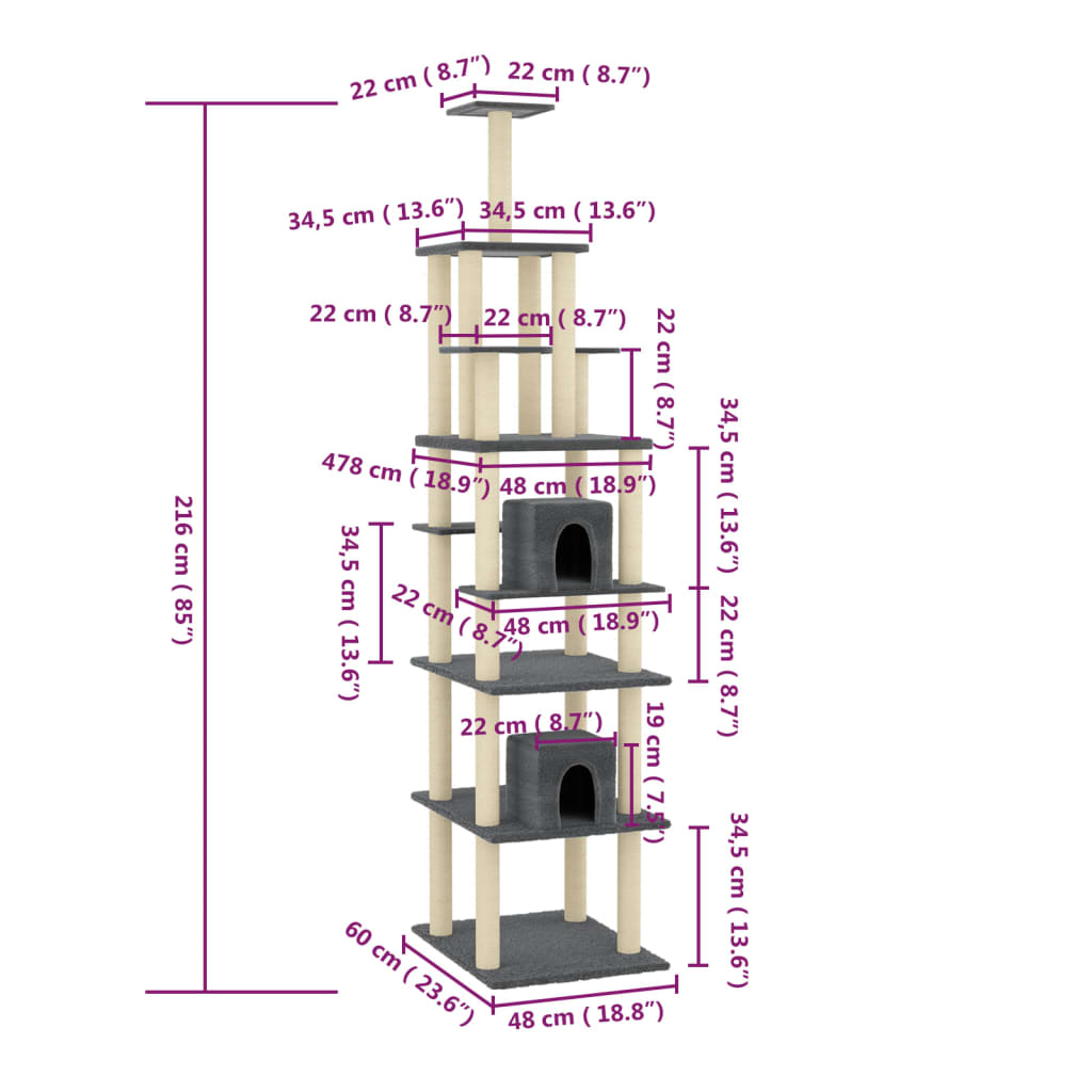 Albero per Gatti con Tiragraffi in Sisal Grigio Scuro 216 cm 171529