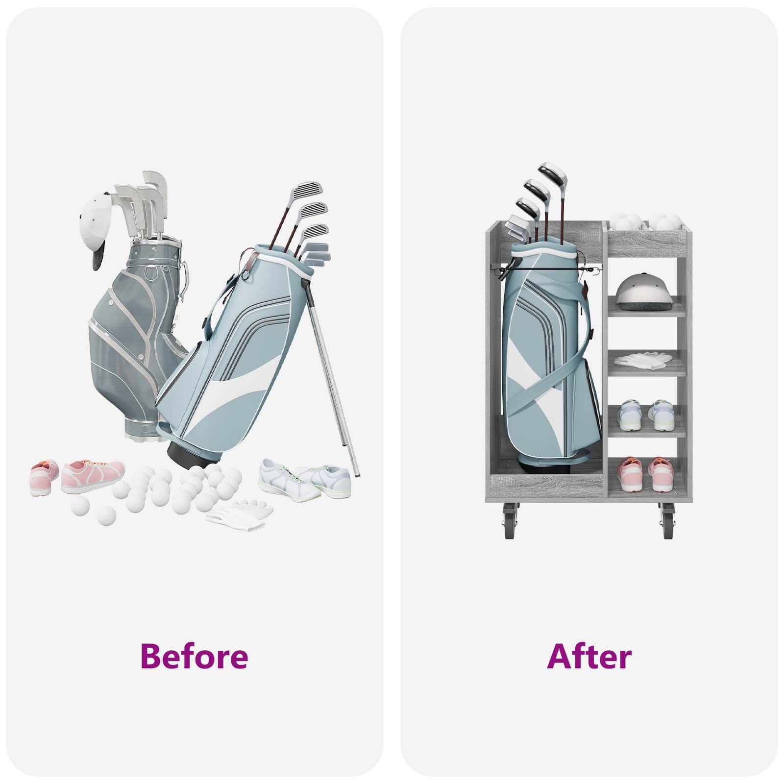 - Caratteristiche /Funzione /Design: Progettato per ampi spazi di stoccaggio, ha diversi ripiani per organizzare accessori da golf e altro. Il design opaco mantiene i contenuti nascosti, mentre lo stile moderno si adatta a vari tipi di arredamento. È funzionale per mantenere ordine e mostrare un buon gusto.