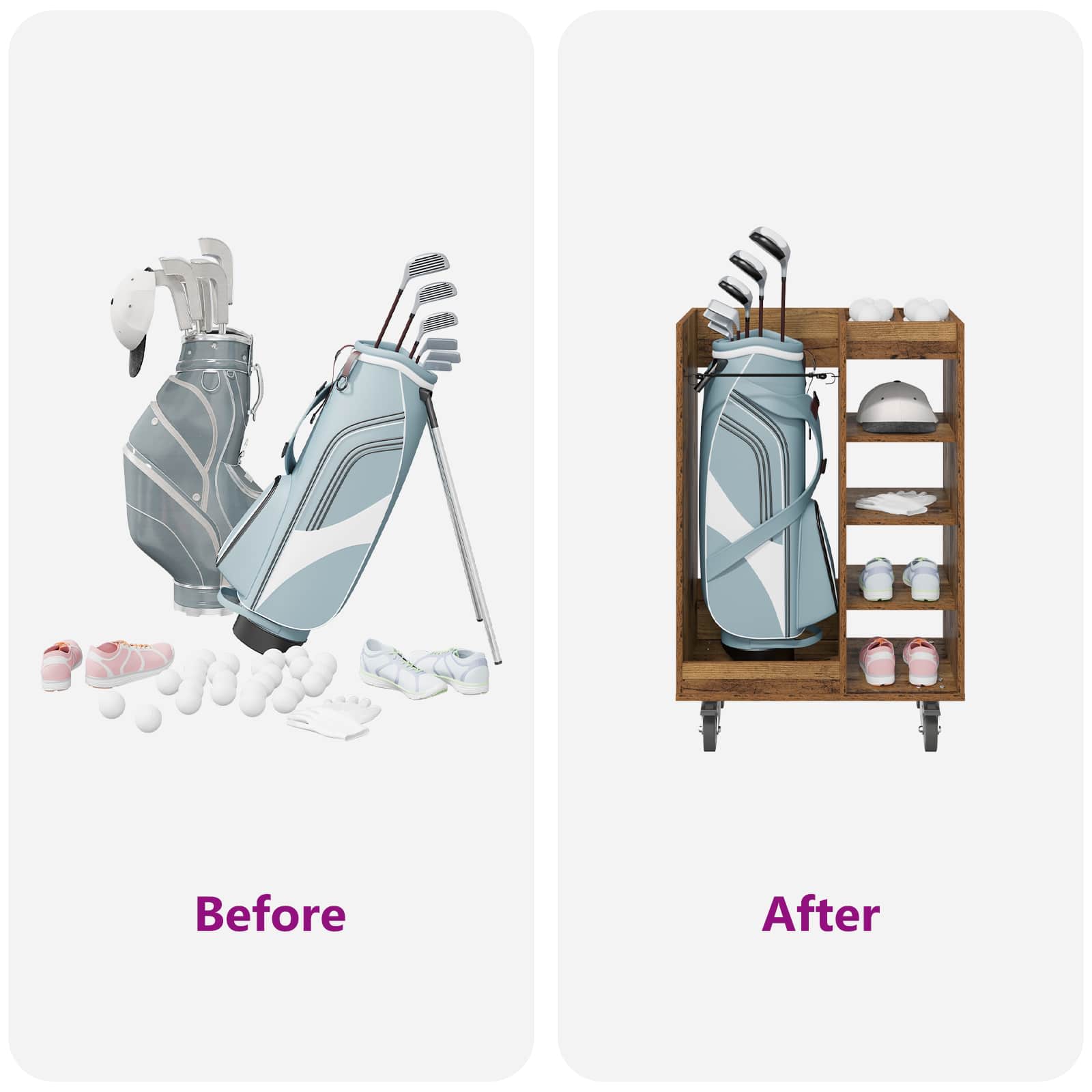 - Caratteristiche /Funzione /Design: Progettato per ampi spazi di stoccaggio, ha diversi ripiani per organizzare accessori da golf e altro. Il design opaco mantiene i contenuti nascosti, mentre lo stile moderno si adatta a vari tipi di arredamento. È funzionale per mantenere ordine e mostrare un buon gusto.