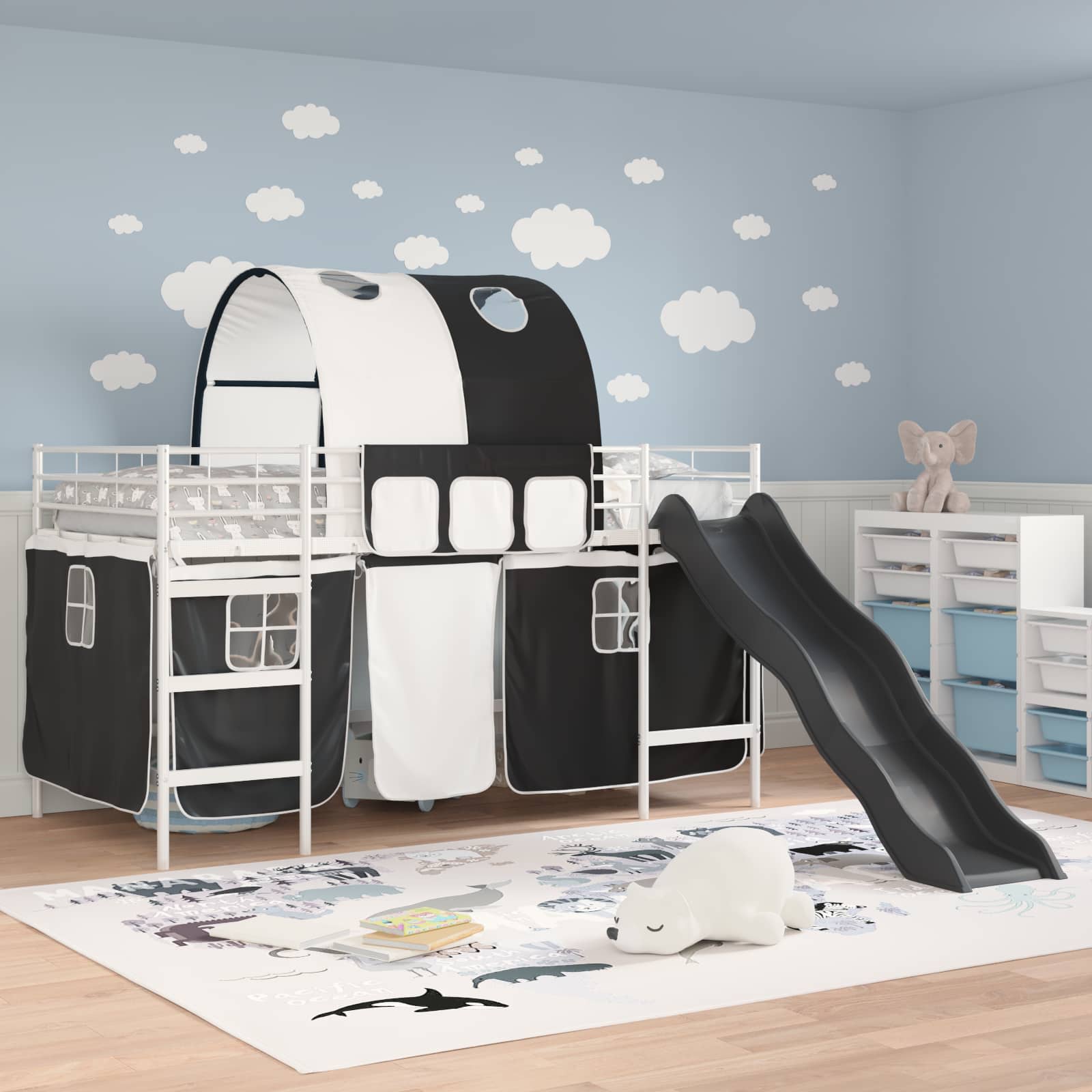 Il letto a castello per bambini con tende, arco e scivolo unisce divertimento e funzionalità, creando uno spazio per dormire che i piccoli ameranno. Progettato per case moderne, questo letto a castello rettangolare ha un aspetto elegante che si adatta a ogni camera. Con materiali resistenti, lo scivolo giocoso e tende personalizzabili offrono un ambiente coinvolgente per riposare e giocare. Le tonalità di nero e blu aggiungono un tocco fresco a ogni spazio, rendendolo pratico e interessante per la casa.