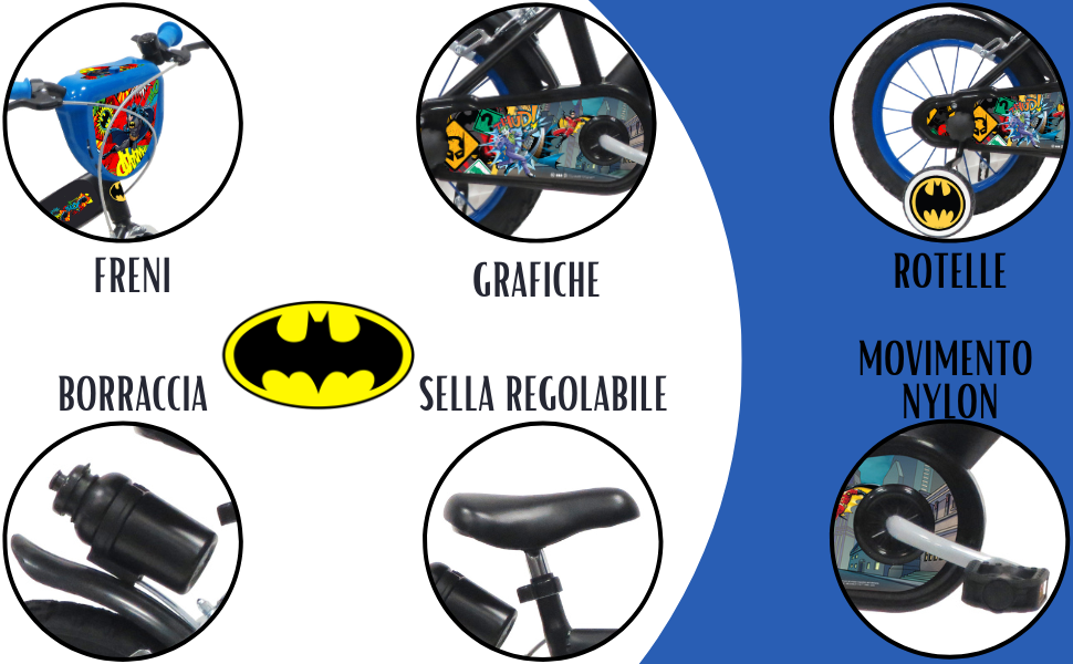 Sui parafanghi ci sono delle bellissime immagini di BATMAN, la sella è morbida per accompagnare le tante ore in bici dei bambini.
