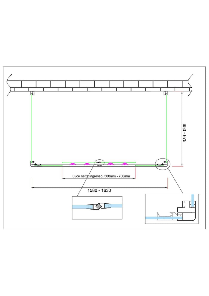 Box doccia 6 mm H 190 parete fissa e porta a 4 ante con apertura centrale MISURA 65-67,5 ANTA FISSA + PORTA 158-163