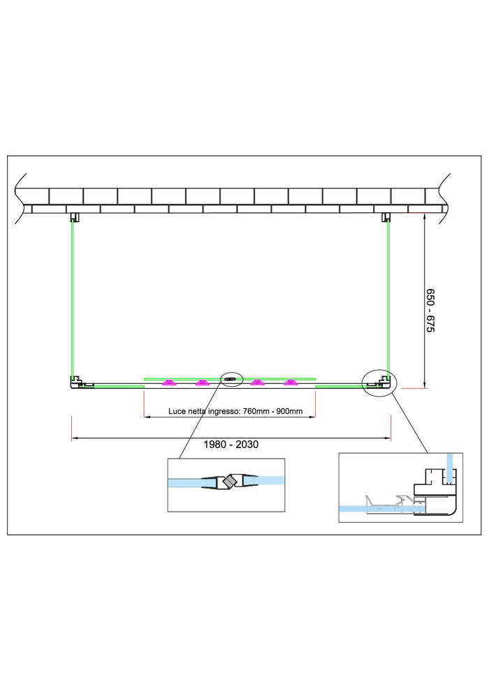 Box doccia 6 mm H 190 parete fissa e porta a 4 ante con apertura centrale MISURA 65-67,5 ANTA FISSA + PORTA 198-203