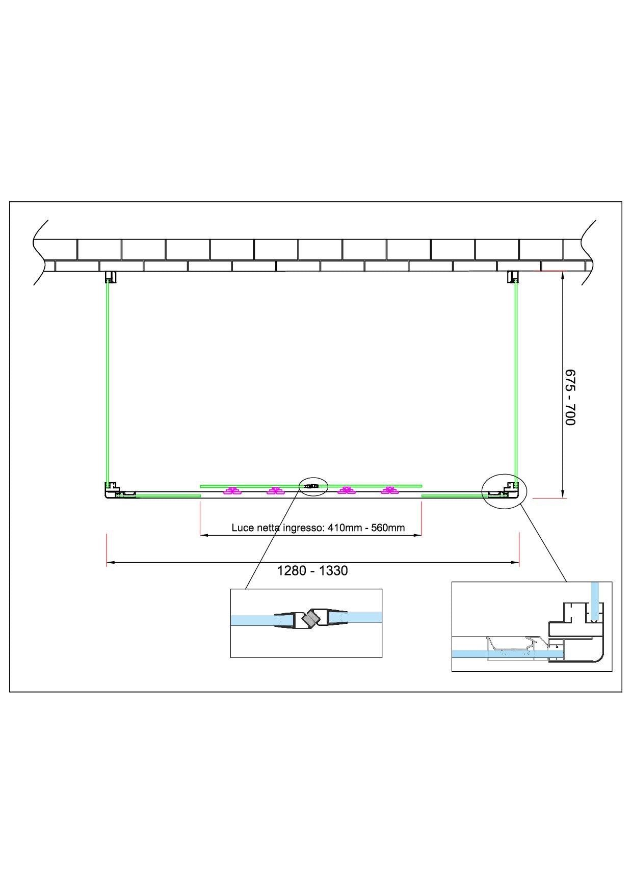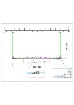 Box doccia 6 mm H 190 parete fissa e porta a 4 ante con apertura centrale MISURA 67,5-70 ANTA FISSA + PORTA 128-133
