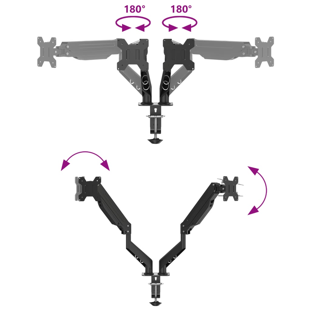 - Regolabile in molti modi: il braccio doppio per monitor è dotato di una molla a gas che consente un'inclinazione di 90° verso l'alto, un'inclinazione di 70° verso il basso, una rotazione di 360° dello schermo e un intervallo di panoramica o rotazione fino a 180°. Grazie all'altezza e all'angolazione regolabili, è possibile alleviare la tensione su spalle e collo.