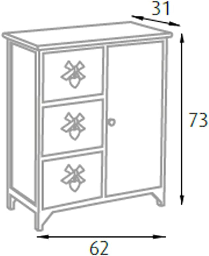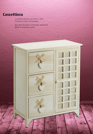 CASSETTIERA 3 CASSETTI CON CUORE E FIOCCHI + ANTA COLORE WHITE WASHED IN LEGNO DI PAULOWNIA Cassettiera 3 cassetti con anta Misure prodotto: 62x32x73h cm; Materiale: legno di paulownia; Misura imballo: 62x32x73h cm Pezzi per imballo: 1 pz