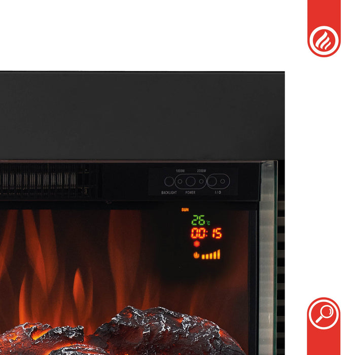La dotazione dei camini elettrici KAMINIO non lascia nulla a desiderare. Un termostato garantisce temperature predefinite costanti, che possono essere adattate a orari di riscaldamento individuali tramite un timer. Il controllo avviene direttamente tramite il pannello di controllo sul dispositivo o il telecomando in dotazione.
