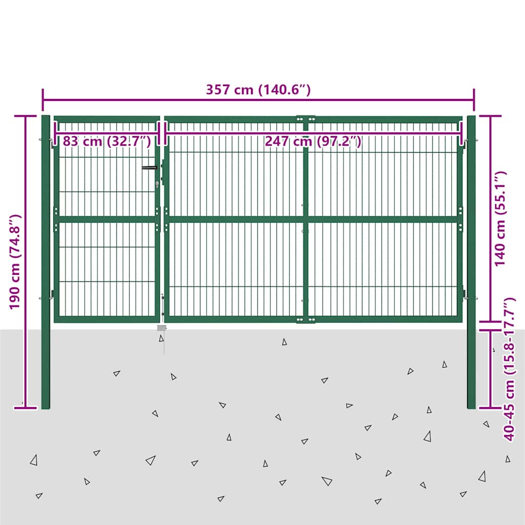 Cancello per Recinzione da Giardino con Pali 350x140 cm in Acciaio Verde 142571
