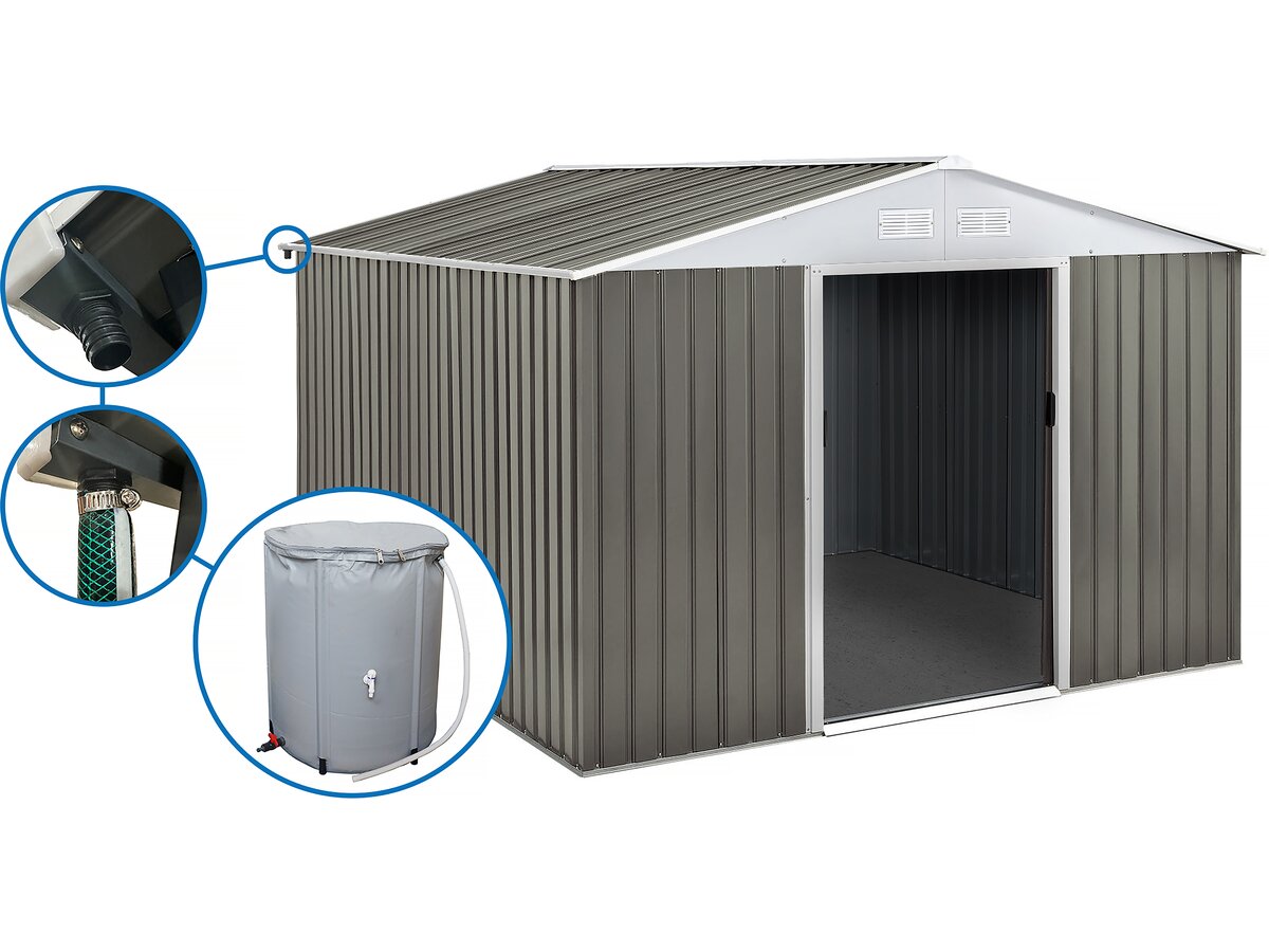 Inoltre, questo capanno è dotato di grondaia e di serbatoio per il recupero dell'acqua, offrendo una soluzione pratica ed ecologica per raccogliere e riutilizzare l'acqua piovana. Scegli la longevità e la praticità del capanno da giardino in metallo "Dallas"