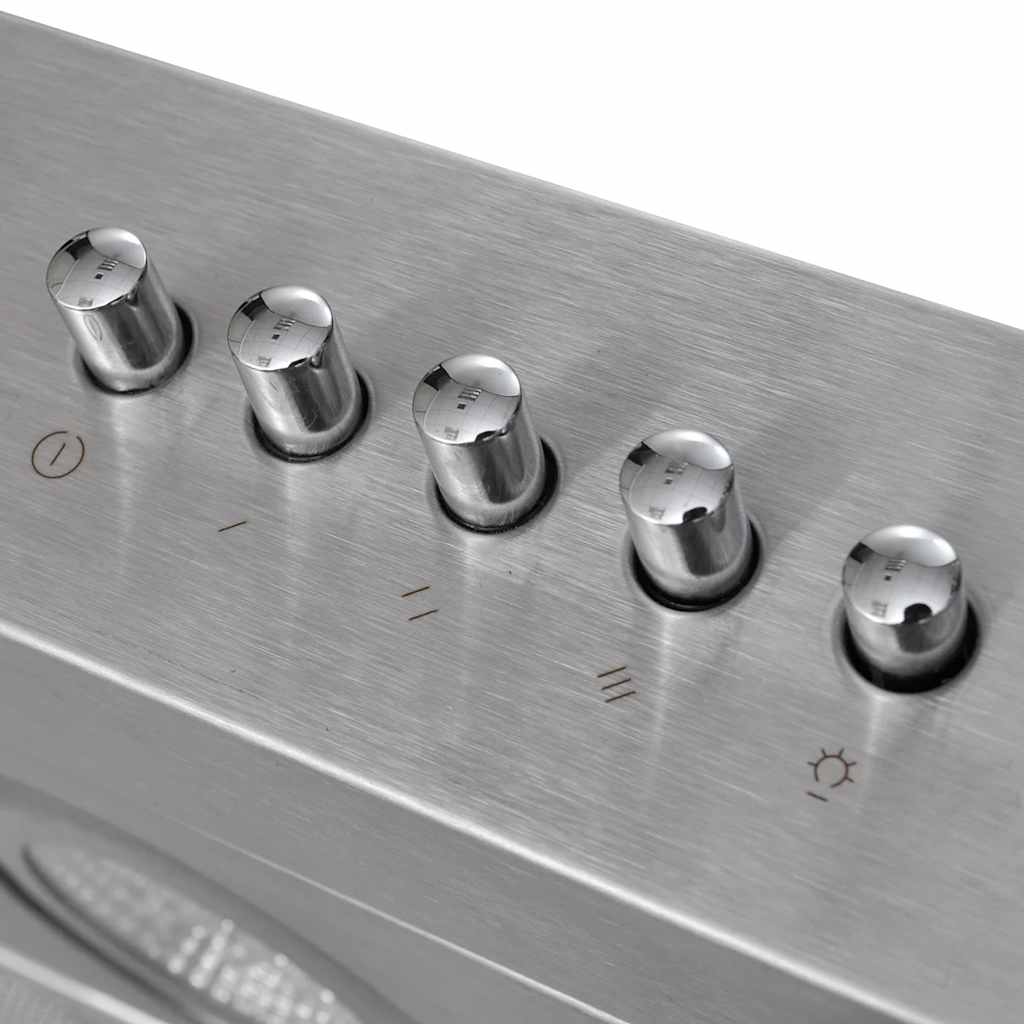Ha una ventola aspirante da 720 m³/h, tre filtri antigrasso lavabili in alluminio e un foro di sfiato interno. Le 2 luci a LED incluse illuminano la cucina sottostante. L'altezza della canna fumaria può essere allungata da 400 mm a 700 mm, a seconda delle vostre esigenze. E' dotata di 5 pulsanti che ti permettono di regolare facilmente la cappa.