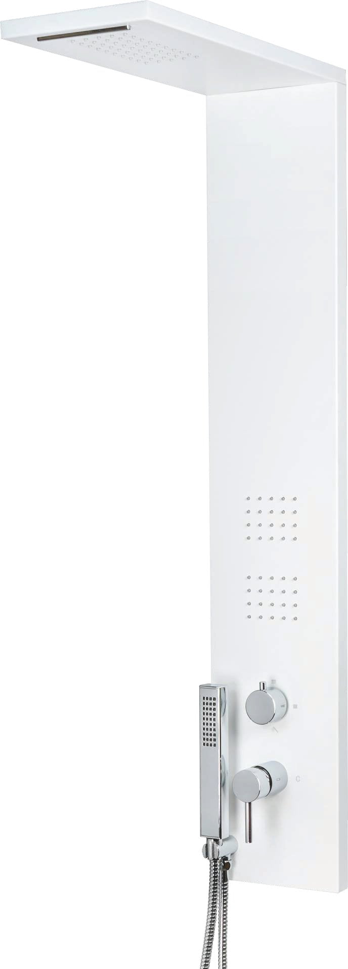 Colonna doccia multifunzione 4 funzioni selezionabili tra: soffione, getto effetto cascata, doccetta e getti orizzontali “massage” Con flessibile in acciaio inox doppia aggraffatura estensibile cm 150÷200 Pressione Min 1.5 bar - Max 5.0 bar Anticalcare, Getto pioggia e cascata verticale, Materiale in Inox "18/10"