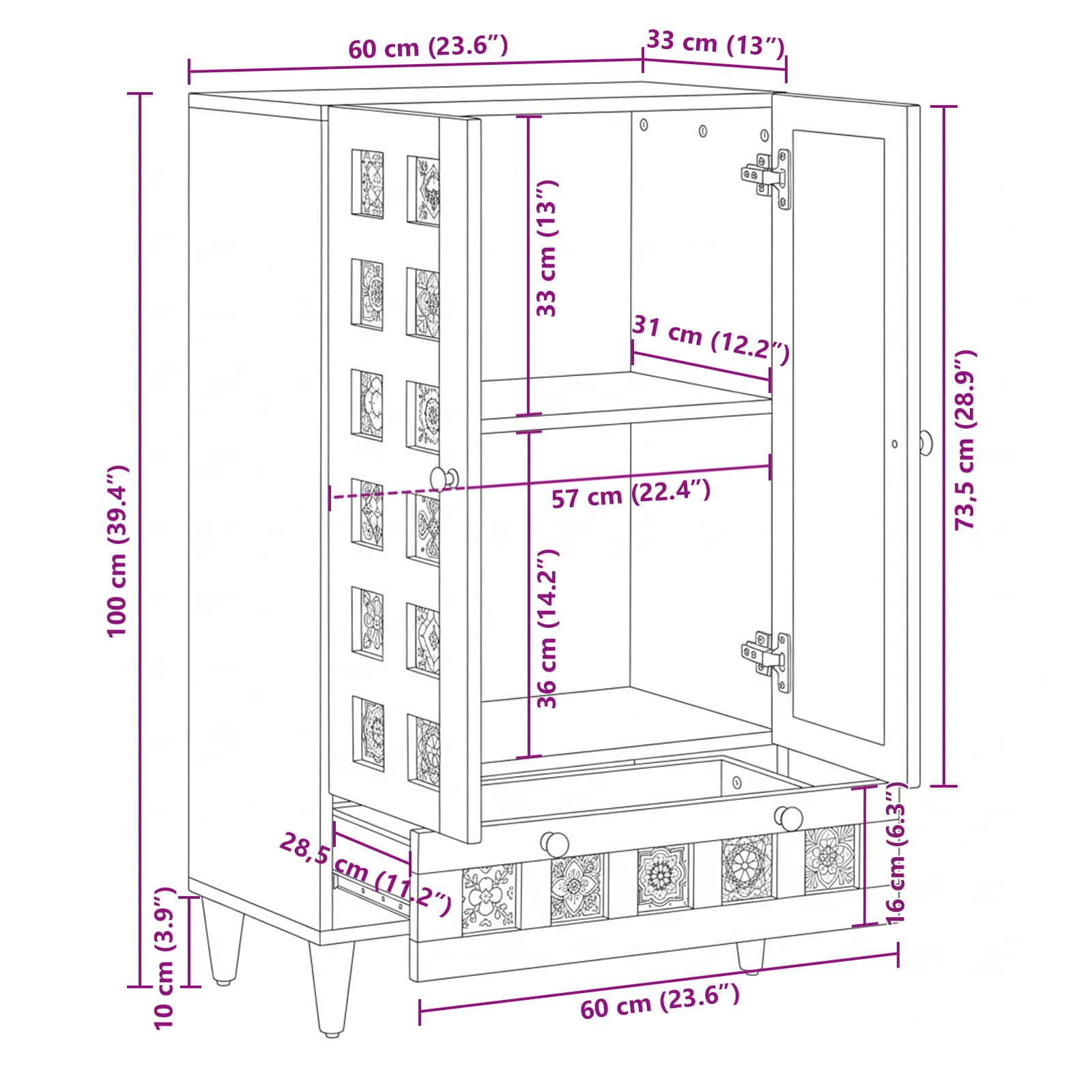 - Materiali: Realizzata in legno massello di mango, molto resistente e con un bel grano, e MDF per stabilità extra. Questo non solo rende la credenza duratura, ma la fa anche sembrare fantastica, perfetta per qualsiasi arredamento.