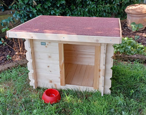 Cuccia Laila in perlina di abete grezzo con tipologia costruttiva blockhouse, spessore parete 16mm, armatura di rinforso pareti in abete naturale; apertura passaggio 27xh42cm; pavimento e tetto in perlina spessore 16mm e copertura con guaina bituminosa ardesiata rossa spessore 3mm per impermeabilizzare il tetto; sottofondo rialzato per una maggiore durabilità del prodotto; tetto facilmente asportabile per agevolare l'ispezione e la pulizia dell'interno. Fornita in kit di montaggio, ferramenta inclusa.