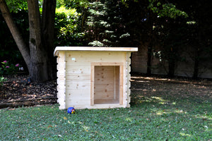 Cuccia Lilly in perlina di abete grezzo con tipologia costruttiva blockhouse, spessore parete 16mm, armatura di rinforso pareti in abete naturale; apertura passaggio 34xh52cm; pavimento e tetto in perlina spessore 16mm e copertura con guaina bituminosa ardesiata rossa spessore 3mm per impermeabilizzare il tetto; sottofondo rialzato per una maggiore durabilità del prodotto; tetto facilmente asportabile per agevolare l'ispezione e la pulizia dell'interno. Fornita in kit di montaggio, ferramenta inclusa.
