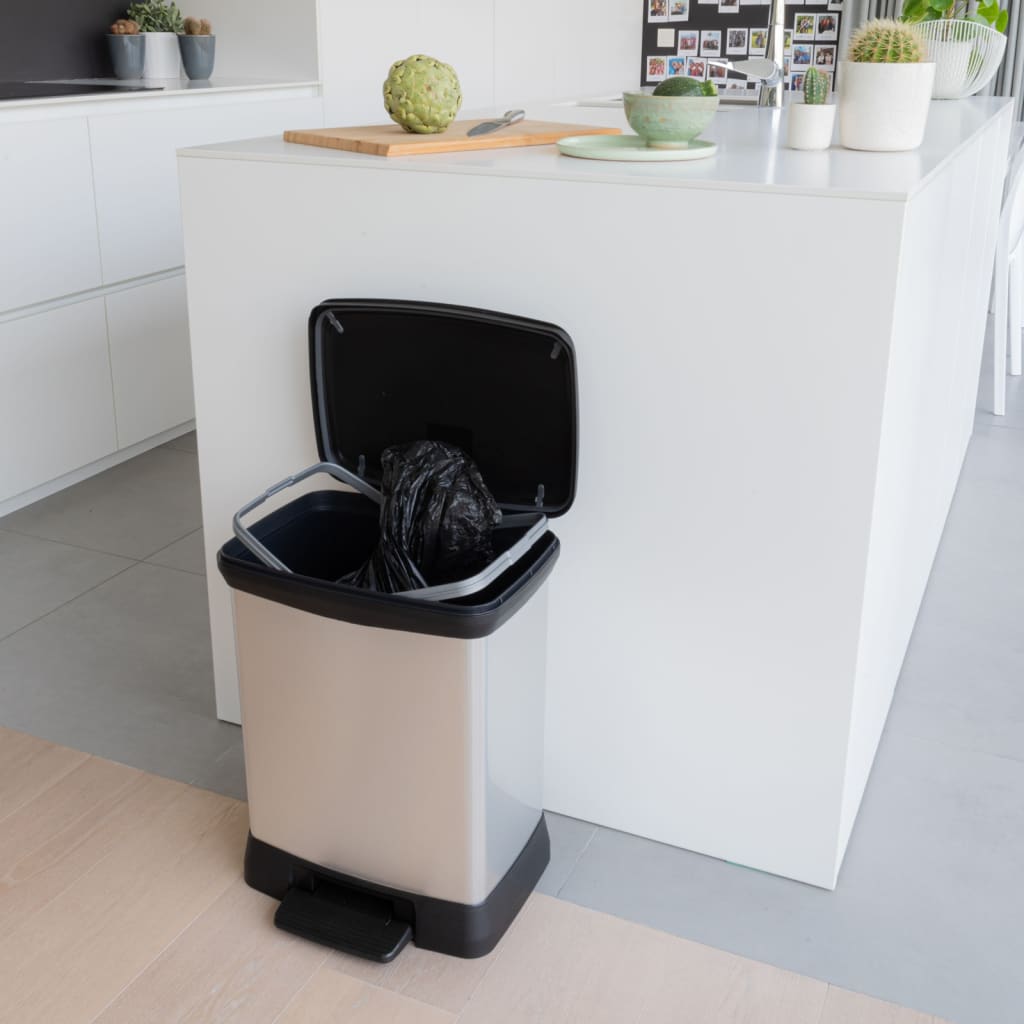 - Capienza adeguata: La pattumiera Deco della Curver è dotata di uno scomparto rimovibile da 30 L, che facilita lo svuotamento del cestino. Sistema anti-vuoto: Il contenitore dei rifiuti è dotato di un sistema anti-vuoto che facilita la rimozione del sacchetto. Il sacchetto dei rifiuti è tenuto in posizione dalle due staffe. Per questo motivo, il sacchetto non è visibile dall'esterno.