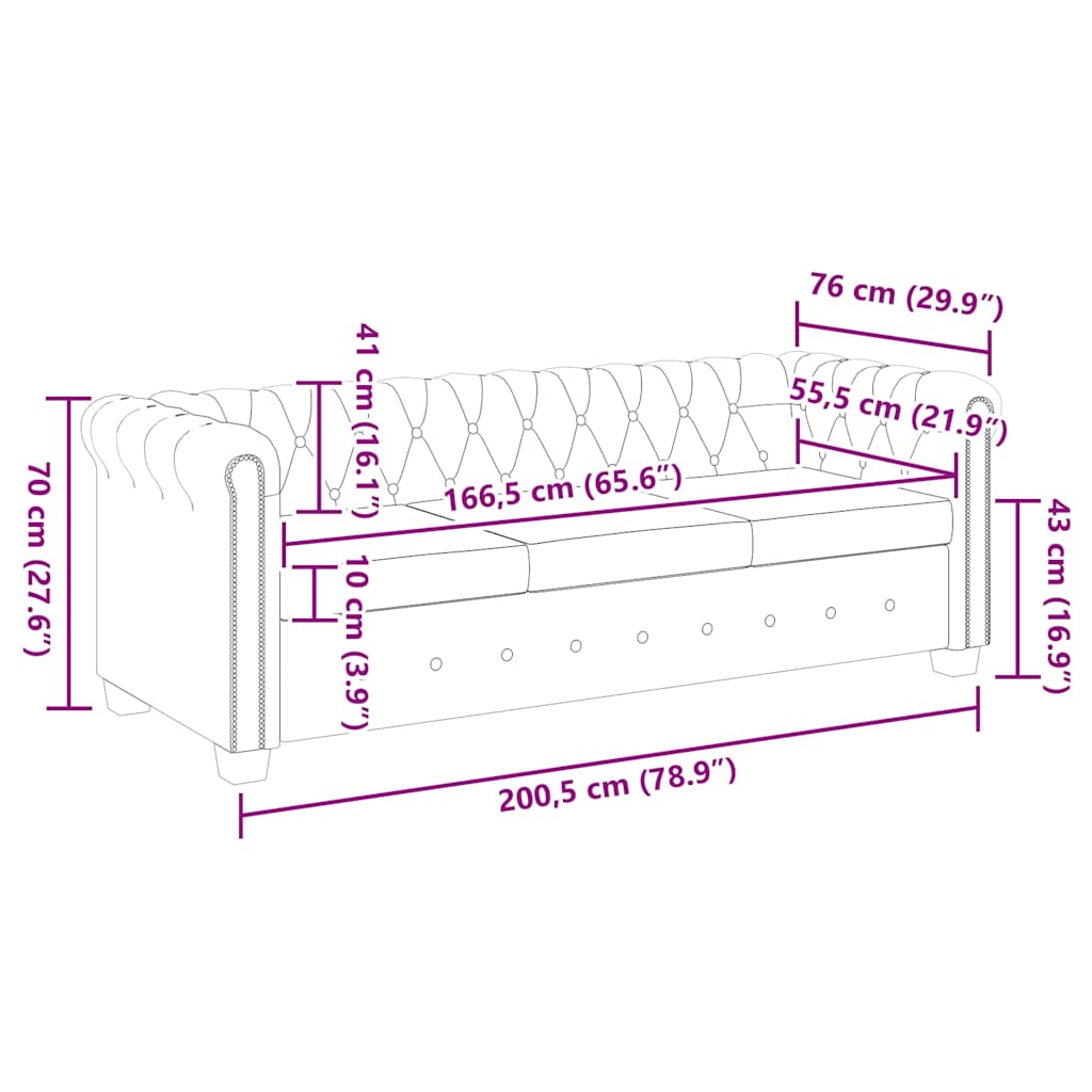 Questo divano Chesterfield è la combinazione perfetta tra comodità e raffinatezza, e sarà un ottimo complemento in qualsiasi casa o ufficio. Questo divano a 3 posti, con i dettagli con borchie e ciuffi e braccioli graziosamente curvi, aggiungerà un tocco di lusso, classe e stile a qualsiasi interno.