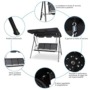 - 【Multifunzione】 Il materiale del sedile è in textilene, resistente e durevole. Il dondolo è fornito di tende protettiva che permette un efficace riparo dal sole. La tenda è antivento, antipioggia e non si sbiadisce facilmente, tutto questo rende il dondolo molto confortevole da usare all'aperto.