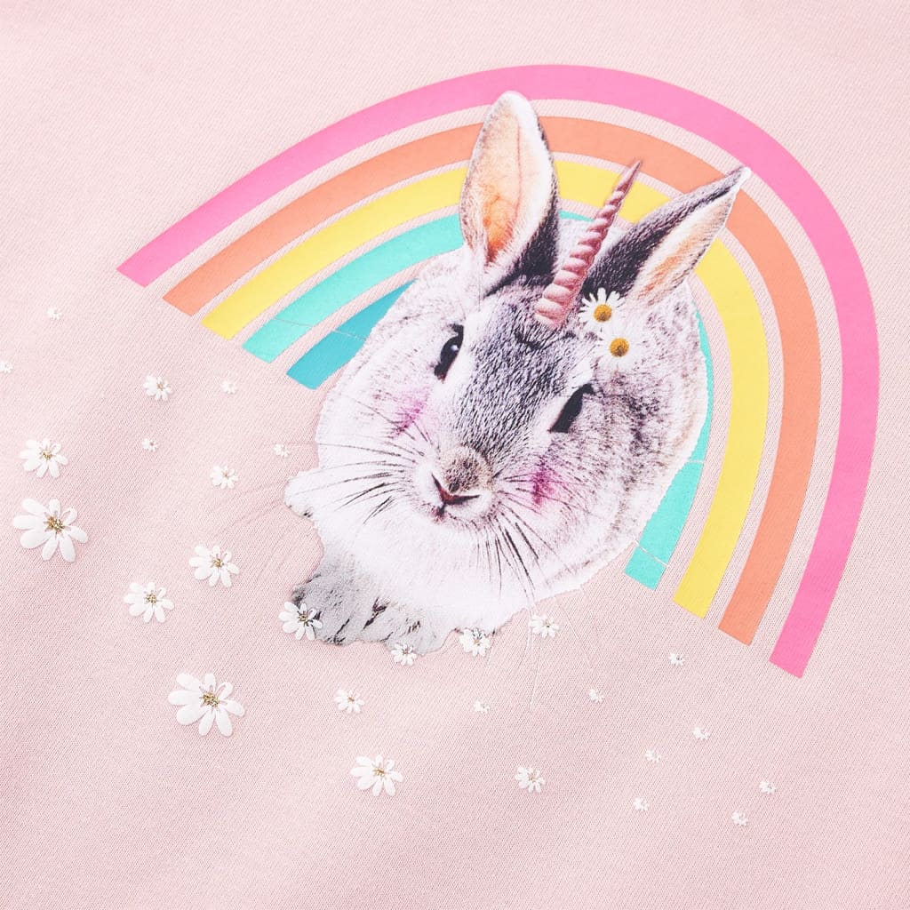 Questa felpa per bambine ha maniche lunghe, girocollo, e bordi a costine sui polsini, sul collo, e sul bordo inferiore. La felpa per bambine presenta un arcobaleno e un coniglio sul davanti. Il top per bambine è realizzato in cotone e in elastan per offrire comfort e traspirabilità.