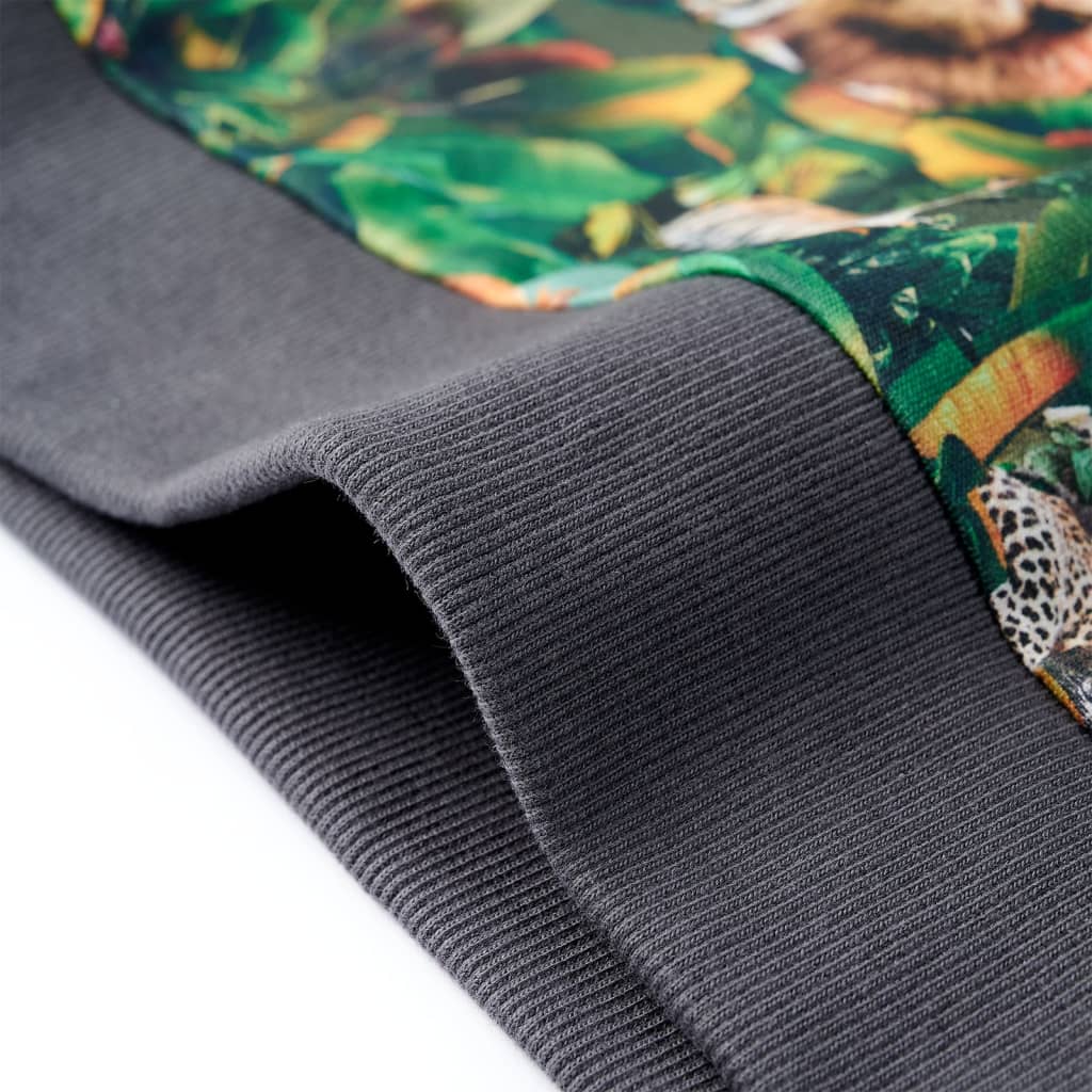 Questa felpa per bambini ha maniche lunghe, girocollo, e bordi a costine sui polsini, sul collo, e sul bordo inferiore. La felpa per bambini ha le stampe ripetute di animali e piante. La felpa per bambini è realizzata in un materiale morbido composto dal 95% in cotone e dal 5% in elastan per offrire comfort e traspirabilità.