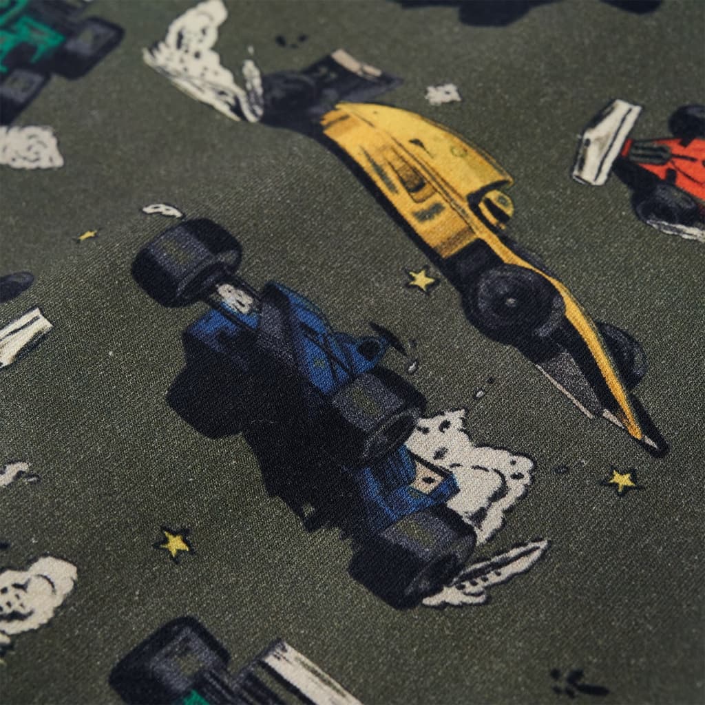 This kids' sweatshirt has long sleeves, a round neck, and rib-knit edges at the cuffs, neckline, and bottom. La felpa per bambini ha le stampe ripetute di auto da corsa. La felpa per bambini è realizzata al 95% in cotone e al 5% in elastan per offrire comfort e traspirabilità.