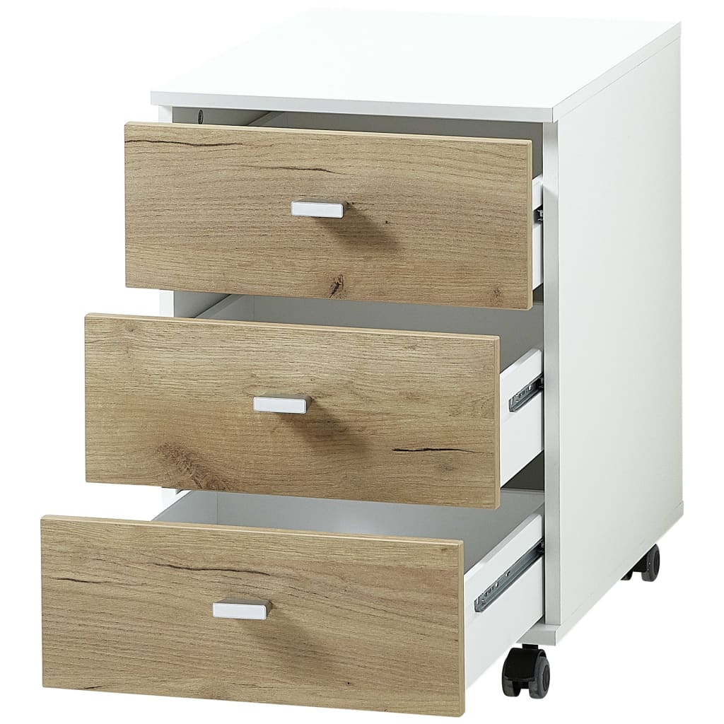 Le sue dimensioni compatte rendono il piccolo contenitore davvero uno strumento salvaspazio, i tre cassetti offrono ancora molto spazio di archiviazione, sempre utile nell'area di lavoro, e ciascuno può essere caricato fino a 5 kg. Grazie alle sue quattro ruote, due delle quali possono essere facilmente bloccate, il mobile su ruote è estremamente flessibile.