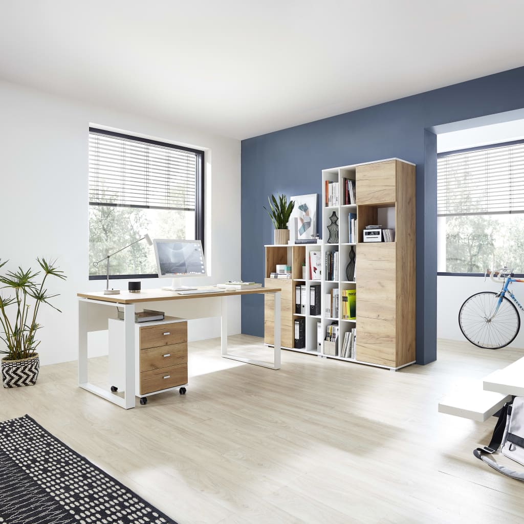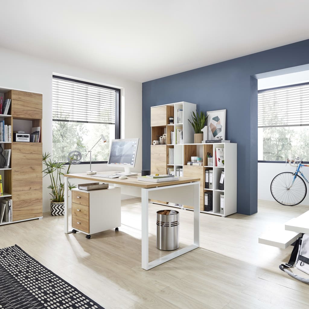Inoltre, la caratteristica principale di questo schedario con ruote è la progettazione della sua struttura, semplice con una colorazione moderna e discreta in bianco e rovere navarra, che lo rende suggestivo se disposto a sé stante o qualora venga combinato con l'arredo esistente.