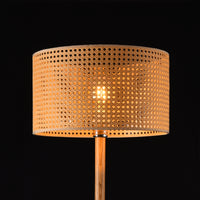 Elegante nella sua semplicità e calda nei materiali, questa lampada da terra è l’espressione di un design che parla il linguaggio della natura. Lo stelo sottile in legno naturale si innalza con leggerezza, sostenendo un ampio paralume cilindrico in rattan intrecciato, il cui motivo geometrico filtra la luce creando delicati giochi di chiaroscuro nell’ambiente. Il colore marrone dorato del paralume si accorda armoniosamente con la tonalità del legno, dando vita a una presenza discreta ma suggestiva.