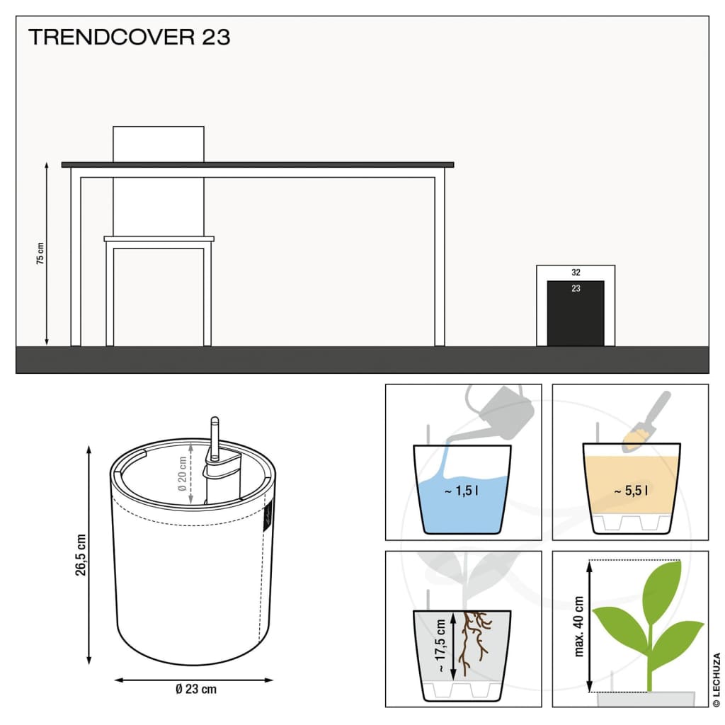 Con la sua superficie strutturata e l'aspetto elegante del feltro, la fioriera e l'inserto in dotazione creano una combinazione elegante e donano un tocco naturale in qualsiasi soggiorno. Ogni fioriera da interni TRENDCOVER è compatibile con il sistema di irrigazione e il serbatoio d'acqua della LECHUZA, il che rende ogni configurazione adattabile e facile da riprogettare a vostro piacimento. Inoltre, si prende automaticamente cura delle vostre piante, assicurando che ricevano la giusta quantità di acqua e sostanze nutritive di cui hanno bisogno per una crescita ottimale. L'inserto della fioriera permette di sostituire facilmente le piante nella fioriera con piante diverse o di potare le radici di tanto in tanto.