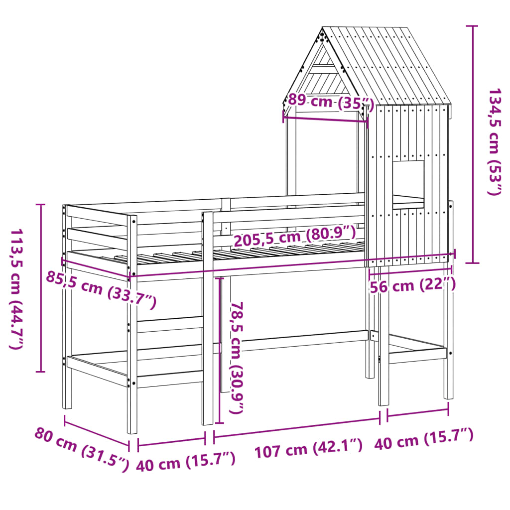 Letto Soppalco con Scala e Tetto Bianco 80x200 cm Massello Pino 3282029