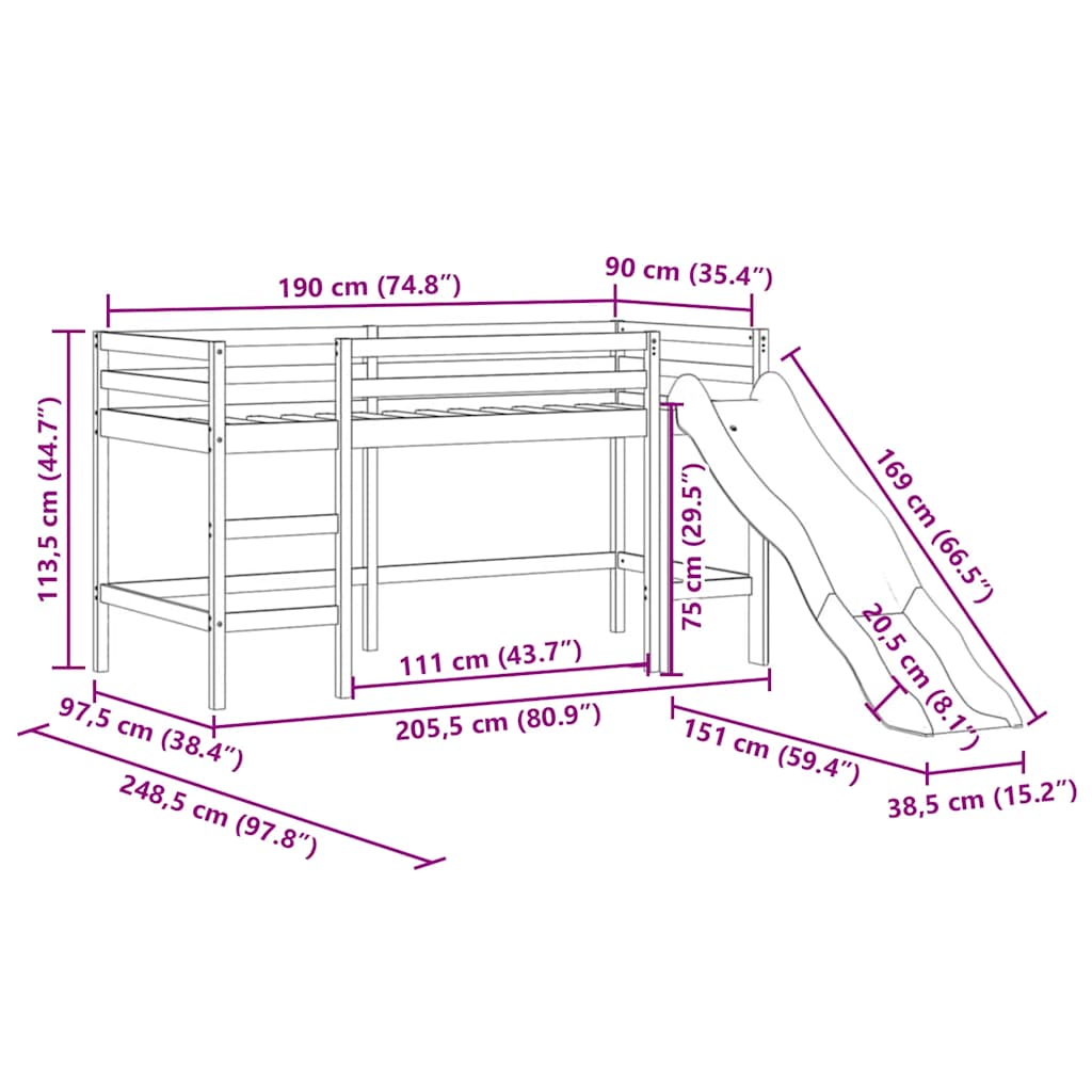 Letto Soppalco con Scivolo Bambini 90x190cm Legno Massello Pino 835910