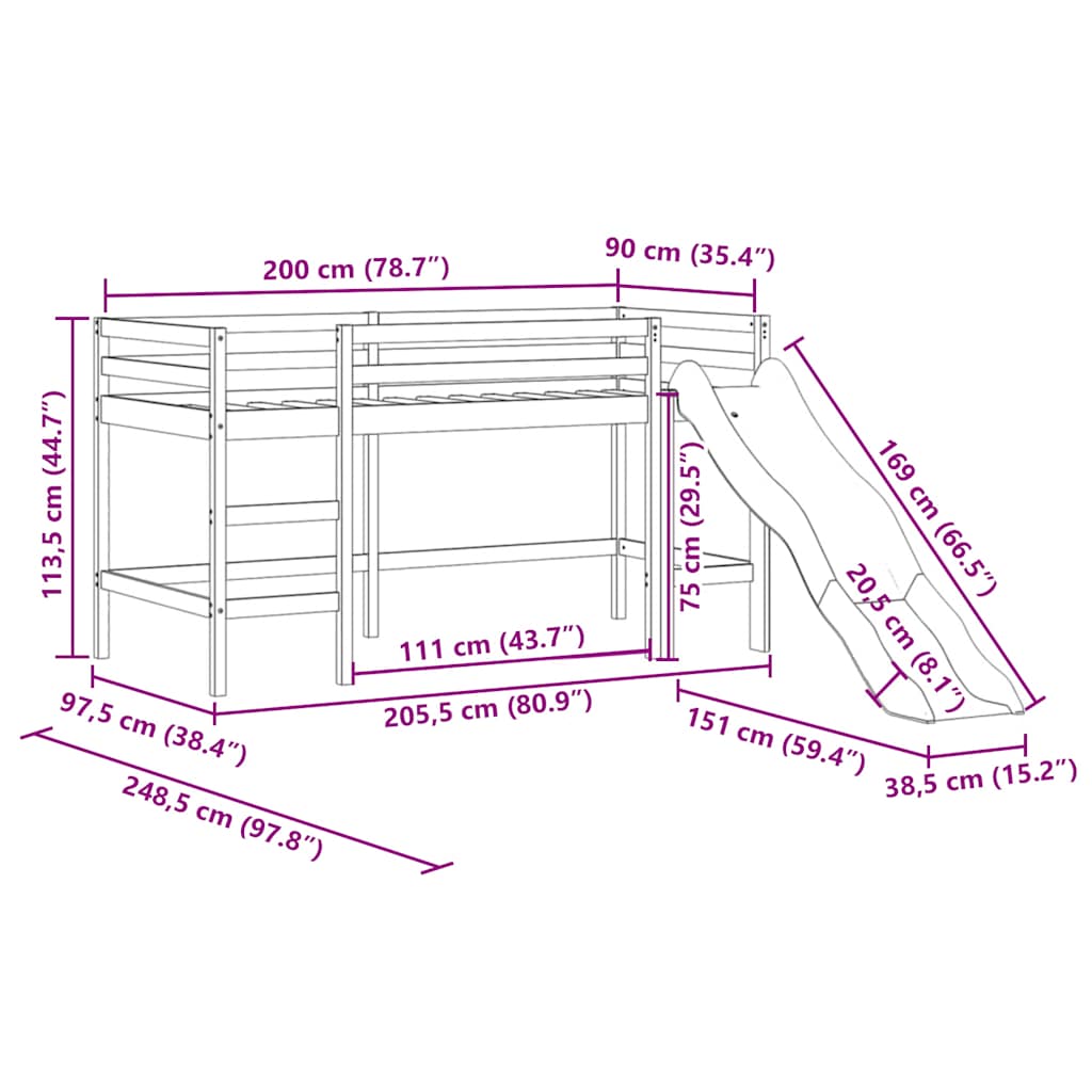Letto Soppalco con Scivolo Bambini Nero 90x200cm Massello Pino 835909