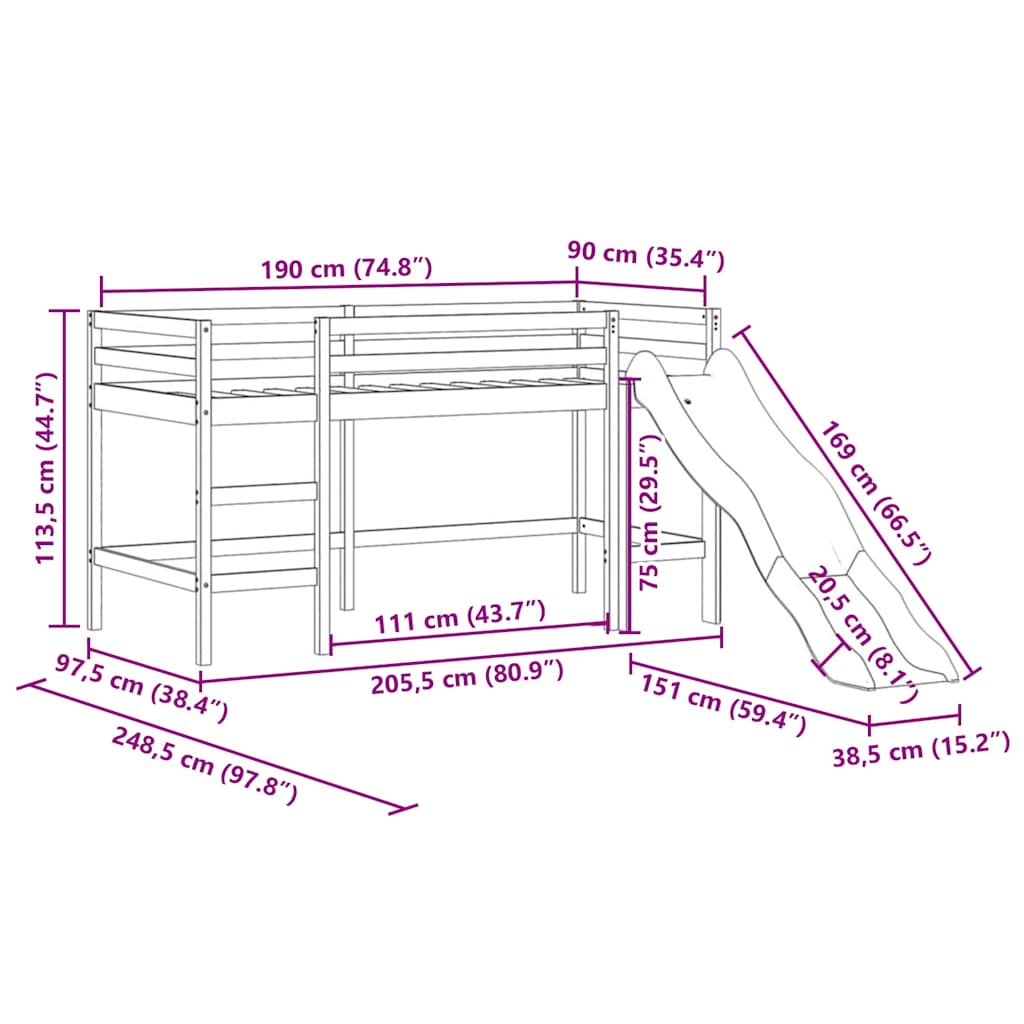Letto Soppalco Scivolo Bambini Bianco 90x190 cm Massello Pino 835911