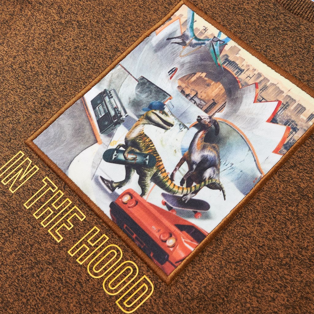 Questa maglietta per bambini ha maniche lunghe, girocollo, e un taglio dritto. Questa maglietta color cognac mélange presenta dei dinosauri nella città. La maglietta a maniche lunghe per bambini è realizzata al 50% in cotone e al 50% in poliestere trattato con un lavaggio al silicone e agli enzimi per conferire un tocco morbido e confortevole.