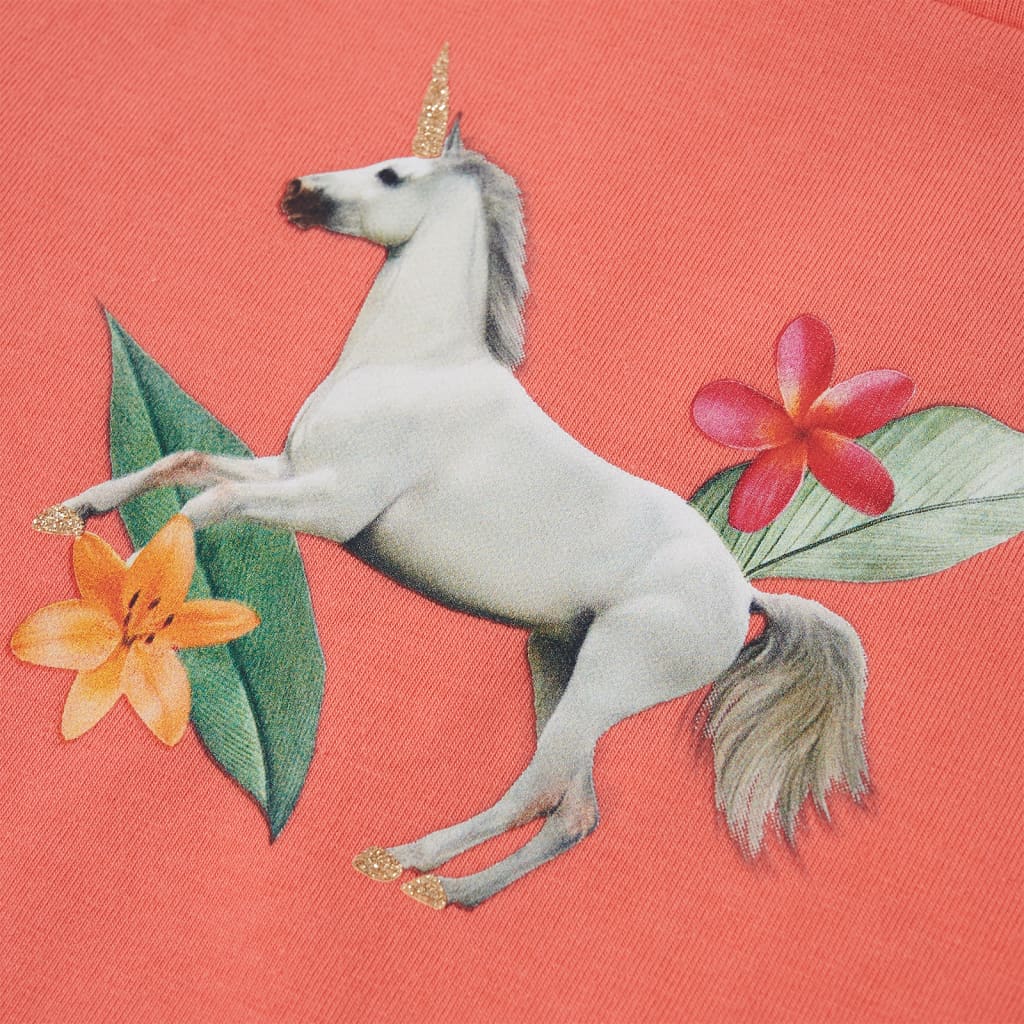 Questa maglietta per bambine ha maniche corte a volant, girocollo, e un taglio dritto. Questa maglietta per bambine presenta uno splendido unicorno con foglie e fiori. La maglietta a maniche corte per bambine è realizzata in un materiale morbido composto dal 95% in cotone e dal 5% in elastan, per offrire comfort e traspirabilità.