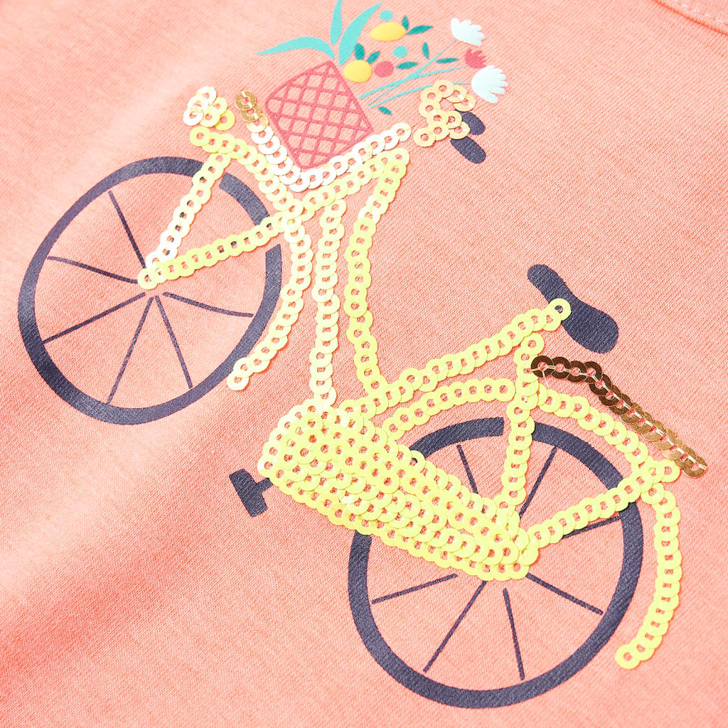 Questa maglietta per bambine ha maniche corte, girocollo, e un taglio dritto. Questa maglietta presenta la stampa di una bicicletta sul petto, che aggiunge un tocco di bellezza e divertimento in più. La maglietta a maniche corte per bambine è realizzata al 95% in cotone e al 5% in elastan, per offrire comfort e traspirabilità.
