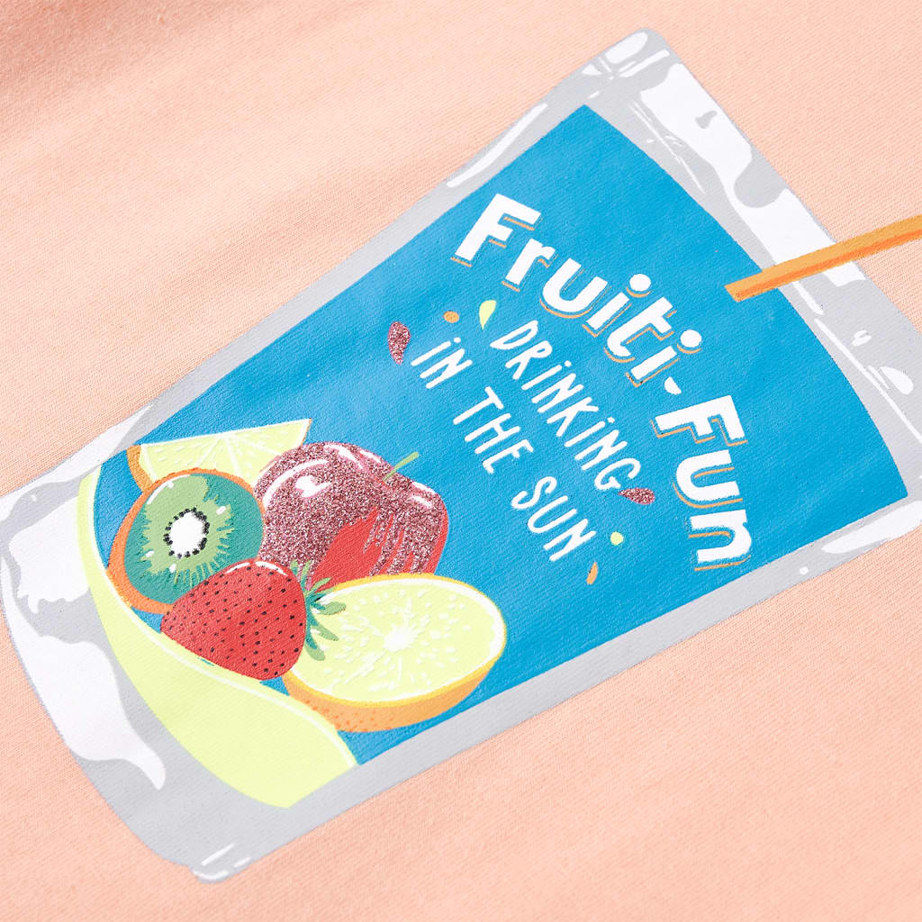 Questa maglietta per bambine ha maniche corte, girocollo, e un taglio dritto. Questa maglietta presenta la stampa di una tazza con della frutta sul fondo. La maglietta a maniche corte per bambine è realizzata al 95% in cotone e al 5% in elastan, per offrire comfort e traspirabilità.