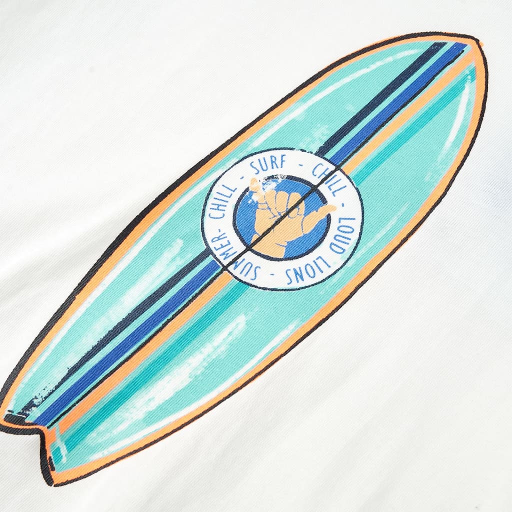 Questa maglietta per bambini ha maniche corte, girocollo, e un taglio dritto. La maglietta per bambini presenta una tavola da surf sul davanti. La maglietta per bambini è realizzata al 100% in cotone per offrire un tocco morbido e confortevole.