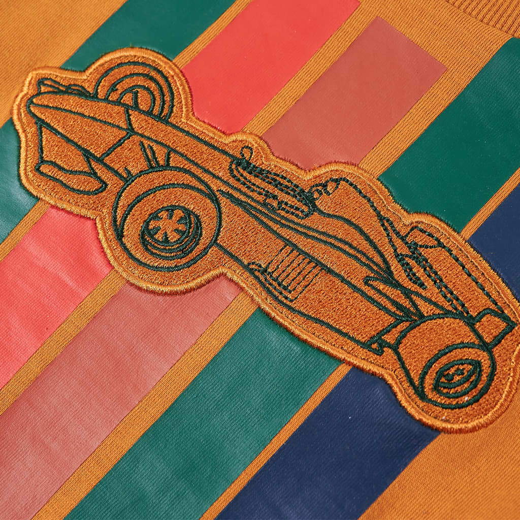 Questa maglietta per bambini ha maniche lunghe, girocollo, e un taglio dritto. Questa maglietta color ocra scuro presenta un'auto da corsa e strisce colorate. La maglietta a maniche lunghe per bambini è realizzata al 100% in cotone trattato con un lavaggio al silicone e agli enzimi per conferire un tocco morbido e confortevole.
