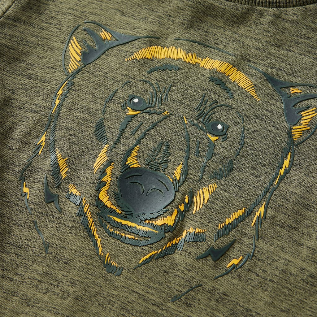 Questa maglietta per bambini ha maniche lunghe, girocollo, e un taglio dritto. Questa maglietta color cachi mélange presenta un grande orso. La maglietta a maniche lunghe per bambini è realizzata al 100% in cotone per conferire un tocco morbido e confortevole.