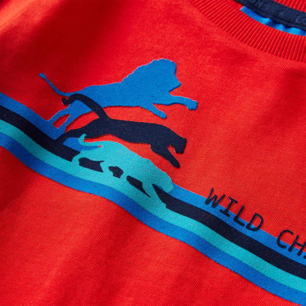 Questa maglietta per bambini ha maniche lunghe, girocollo, e un taglio dritto. Questa maglietta rossa presenta degli animali selvatici. La maglietta a maniche lunghe per bambini è realizzata al 100% in cotone per conferire un tocco morbido e confortevole.