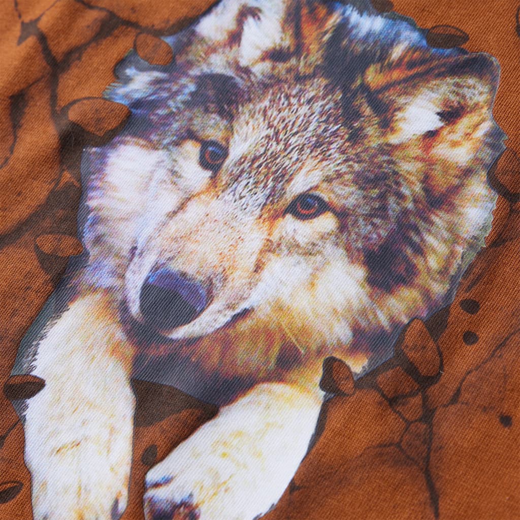Questa maglietta per bambini ha maniche lunghe, girocollo, e un taglio dritto. Questa maglietta color cognac presenta un grande lupo. La maglietta a maniche lunghe per bambini è realizzata al 100% in cotone trattato con un lavaggio al silicone e agli enzimi per conferire un tocco morbido e confortevole.