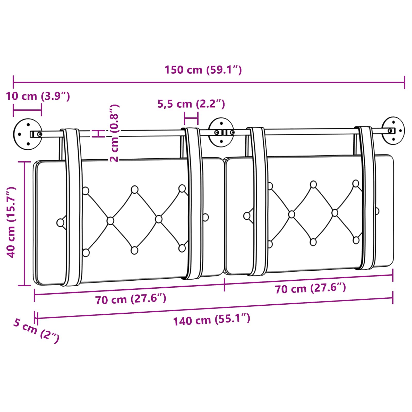 - Supporto di montaggio regolabile: La testiera si appende al muro, permettendoti di scegliere l'altezza che più ti piace e risparmiare spazio a terra.