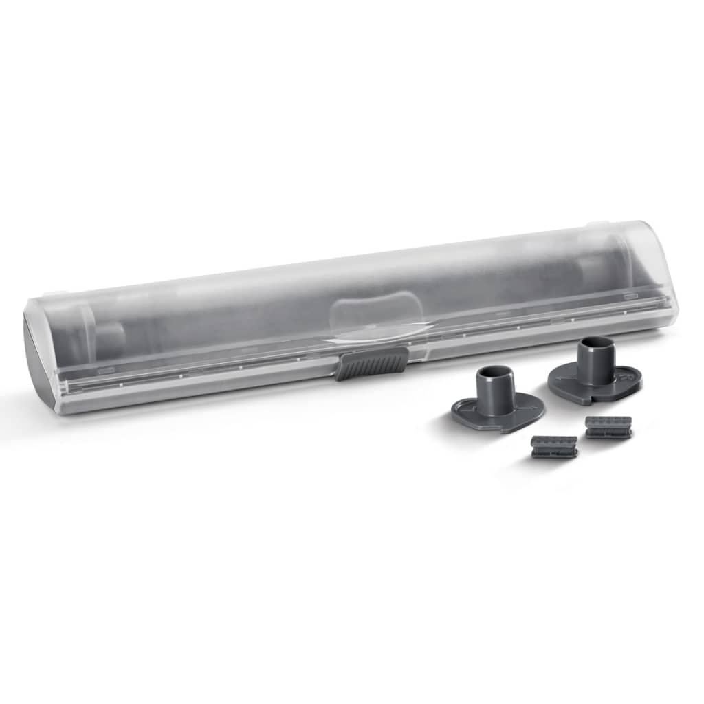Inoltre, è dotato di uno speciale sistema di ritenzione del foglio per bloccare il bordo finale della pellicola. Il distributore di pellicola da cucina viene fornito anche con il materiale di montaggio.